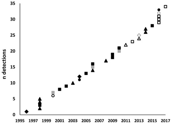 Accumulation of new exotic forest pest species detected in Australia between 1996 and 2017 made by general (solid) and specific (open) surveillance methods as defined by the Food and Agriculture Organization [36]. Insects are designated by Coleoptera = circles (n = 4); Hemiptera = triangles (n = 10); other = diamond (n = 3) and pathogens = squares (n = 17). Species that established in mainland Australia are in black, while those that did not establish are in grey.
