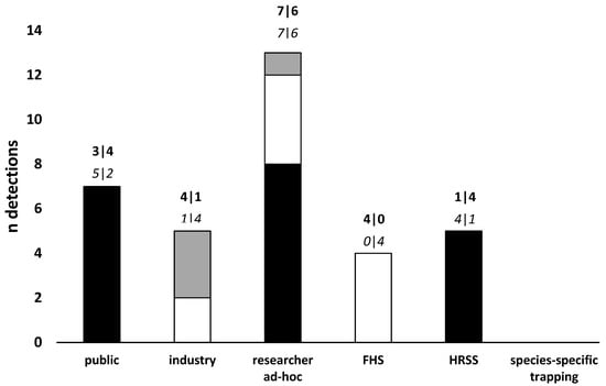 Seventy-one percent of detections of exotic Australian forest pests since 1996 occurred via general/passive surveillance (public, researchers, or industry), rather than during specific/active surveillance (Figure 2), with insects and pathogens equally likely to be detected by either surveillance type (χ21 = 0, p = 1). Likewise, in New Zealand, from 2011 to 2014, a similar proportion (66%) of exotic plant pest incursions were detected by general surveillance (public, researchers, industry) compared with 34% by specific surveillance (biosecurity officers) [75]. By the very nature of general surveillance, pests are often detected only after they have established and spread [76]. Of the 71% of detections made by general surveillance in our study, 24% were made by the public, 35% by researchers, and 12% by industry. Although there is currently no formal national forest post-border biosecurity surveillance program in Australia [11,13], there has been a significant increase in detections of new pests via specific surveillance since 2010 (χ21 = 12.1, p < 0.001; Figure 2). Some of these pests were detected in urban areas under national or state biosecurity surveillance programs (Table 1): e.g., black poplar leaf aphid (Chaitophorus leucomelas) under the National Plant Health Surveillance Program (NPHSP); Asian woolly hackberry aphid (Shivaphis celti) under the National Border Surveillance program; and pinewood nematode (Bursaphelenchus aff. vallesianus/sexdentati) under the New South Wales Forestry High Risk Site Surveillance Program. Others were detected during forest health surveillance programs in plantations, which have recently incorporated targeted biosecurity surveillance activities to detect exotic or cryptic pests [11]: e.g., the blue stain fungi Ophiostoma pallidulum and O. angusticollis, and pinewood nematode (B. hildegardae)—the first records for these pests in the Southern Hemisphere.