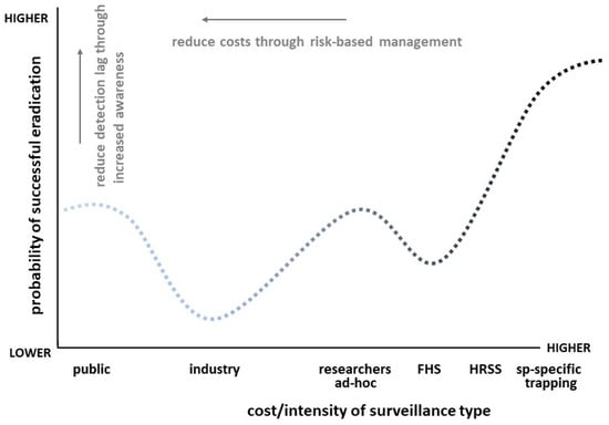 Here, we introduce a generalised Surveillance Effectiveness Curve to illustrate the benefits of investing in targeted post-border surveillance—to detect new exotic pest incursions—in increasing the likelihood of successful eradication (Figure 4). In parallel with the generalised invasion curve, we can see that investment in structured surveillance increases the chances of early detection, thus reducing the cost—and increasing the probability of success—of eradication. Broadly, surveillance methods to detect new exotic pest establishments involve trapping, visual searches, and reports by citizens [23]. Our curve shows that these methods have different costs associated with them: as a surveillance method, public reporting is less costly than a trapping program. However, as many detections are made through activities that are not dedicated to biosecurity surveillance—by industry, researchers, and forest health surveillance (FHS)—there is not a direct relationship between detection costs and early detection success. For example, FHS is a detection method more costly and less likely to result in eradication because it is conducted in plantations and primarily aimed at mapping the extent and severity of established or endemic pests. The role of the public in early detection should not be underestimated: Australia’s only successful eradication in forestry resulted from a public detection, while almost half of New Zealand’s new exotic plant pests are reported by the general public [25,75]. In fact, passive detection, such as public reporting, is linked to a higher likelihood of eradication than searching high risk sites [25]. Moreover, the impact of mobilising public interest through biosecurity awareness is two-fold: increasing prevention/detection of exotic species invasions and increasing support for invasion mitigation measures [93]. Engaging and training city and shire councils, arborists, and community groups likewise increases biosecurity awareness and surveillance in regional and urban centres and can further facilitate early detection. The workload involved with public reports is significant, and while a public pest reporting system is important (e.g., in Australia the Exotic Plant Pest Hotline (http://www.planthealthaustralia.com.au/biosecurity/emergency-plant-pests/reporting-suspect-pests/)), biosecurity agencies require adequate surveillance and diagnostic resourcing to be able to respond to these reports. In New Zealand, although the public detected 42% of new exotic pests from 2011 to 2014, this detection involved a positive rate of only 8% from over 2280 reports [75]. The Queensland citizen science project “WeedSpotters” returned a similar positive detection rate (~10% of >3000 samples were notifiable priority weed incursions) and led to eight new exotic detections in a two-year period [94].