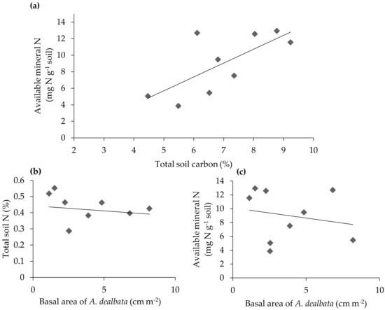 Relationship between total basal area of A. dealbata and the amount of nitrogen at each soil site in two different forms: (a) Relationship between total soil carbon (%) and available mineral nitrogen (N). Concentrations are determined from soil collected from each of the nine sites in a eucalypt forest. (b) Total soil organic matter quantity in terms of total soil nitrogen (%) and the total basal area at each soil site and (c) Available mineral N present at each site and the relationship to total basal area of A. dealbata.