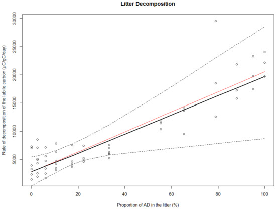The relationship between the rate of labile carbon decomposition and of the nitrogen fixed A. dealbata in the litter. The red line represents the initial linear regression model to the median points (R2: 81.8%), and the black line shows the median of the resampled points (R2: 81.7%). Dotted lines represent the confidence bounds for the resampled data.