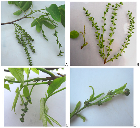 Expressions of male and female inflorescences in Cyclocarya paliurus. (A) Male and female inflorescences of the protogyny (PG) type. The female flowers are mature, while the male flowers are still enclosed. (B) Protandry (PA) inflorescences at the elongation stage, showing the developmental differences between the two sexual inflorescences. Abnormal inflorescences include (C) a single male instead of a female inflorescence at the apex of growing shoot and (D) a female inflorescence mixed with a male flower.