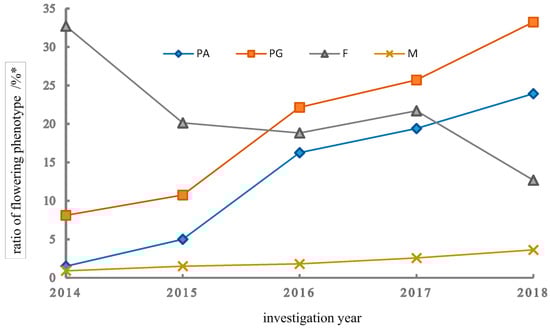 Although there was a tendency for the number of flowering individuals to increase (Table 1), the changing trends were divergent for various flowering phenotypes (Figure 2). In 2016, there were rapid increments of PA and PG morphs, accompanied by a rapid decrease in individuals of the F type. Of the four flowering phenotypes, similar increasing tendencies were observed in PA and PG types, but the proportion of PA was always less than that of PG. In addition, only a slight increment was observed in the M type, rising from 0.9% to 3.2%. On the contrary, the proportion of F type individuals dropped significantly from 32.71% to 12.68% across the five-year period (Figure 2).