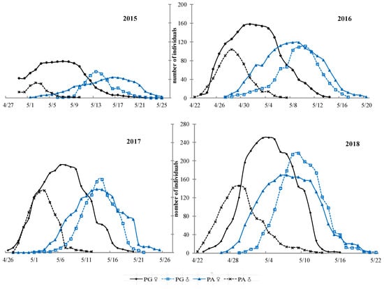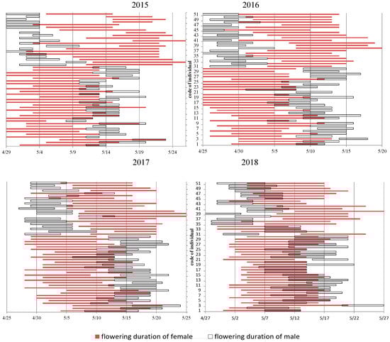 Flowering phenology of males and females within individuals based on 21PA and 30PG trees of C. paliurus during 2015–2018.