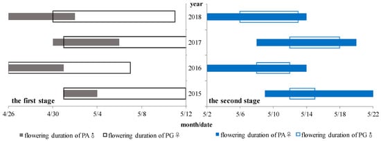 Figure 4 illustrates that two incomplete separation flowering phases existed in the population. In the first phase, from 22–26 April to 12–18 May, PG females and PA males were in bloom, while during the second phase, from 28 April 28–1 May to 20–26 May, PG males and PA females were in bloom. Each phase lasted 20–25 days and the obvious overlap (7–10 days) of inter-phases varied across years. Generally, the female flowering duration (>25% individuals in the population in bloom) for two morphs was significantly longer than that of the males (one week).
