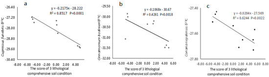 Relationship between the δ13C value in the plant leaves and the comprehensive lithological soil condition. (a) Cupressus funebris, (b) Cinnamomum bodinieri, (c) Coriaria nepalensis.
