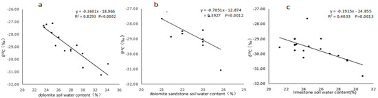 Relationship between the δ13C value of the dominant species and the soil water content in different lithological soil types. (a) dolomite, (b) dolomite sandstone, (c) limestone.