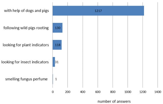 A large portion of respondents (about 62%) were aware of the historical use of truffles. However, most respondents were of the opinion that truffles were not commonly eaten in the past (only 4.3% of respondents thought they were once a common food item), an opinion especially common among those younger than 36 years old. More than one third of foresters knew the type of soils conducive to truffle growth. Only about 5% indicated that truffles were present on non-calcareous soil. A great number of respondents (1217) knew that searching for truffles is provided with help of dog or swine (Table 5, Figure 2). More than 200 respondents were familiar with other methods of truffle hunting (Figure 2). Out of the four species of fungi (Table 3 and Table 5), G. esculenta (Pers.) Fr. was the one most respondents were able to identify. Men more often indicated that truffles grew in their forest district. About 28 per cent of respondents were familiar with truffle products, especially people younger than 46 years of age.