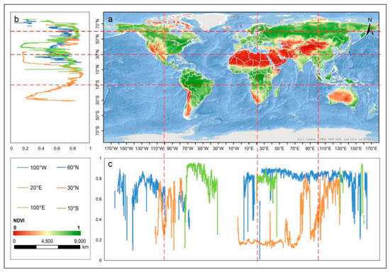 We selected several warp and weft lines (100° W, 20° E, 100° E, 60° N, 30° N, 10° S) with a large distribution of continental area to analyze the spatial distribution characteristics of NDVI values (Figure 1). 100° W meridian line passes through the North America, NDVI values are higher in Canada (with some regions exceeding 0.8 and rising) and lower in the western United States [39]. The 20° E meridian line passes through the higher NDVI value areas such as central Europe and the Africa region, as well as the extremely low NDVI value areas of the Sahara. 100° E meridian line passes through the Asian continent, NDVI value is higher in Asia except for Central Asia. In the north temperate zone where the 60° N parallel passes, the NDVI values are relatively high. In the north temperate zone where the 30° N parallel passes, the distribution of NDVI is very diverse. In the tropics where the 10° S parallel passes, the value of NDVI is higher.