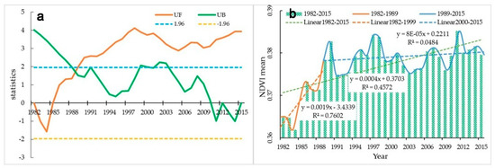 Mann–Kendall mutation test (a) and annual NDVI trends from 1982 to 2015 (b).