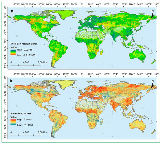 The average annual NDVI from 1982 to 2015 was 0.38. According to the Mann–Kendall mutation test, NDVI mutation occurred in 1989 (Figure 2a), with a significant increasing trend from 1982 to 1989 at a rate of 1.9 × 10−3 per year, and a slowly increasing trend from 1990 to 2015. Overall, the global average annual NDVI had been rising at a rate of 4 × 10−4 per year for 34 years. (Figure 2b)