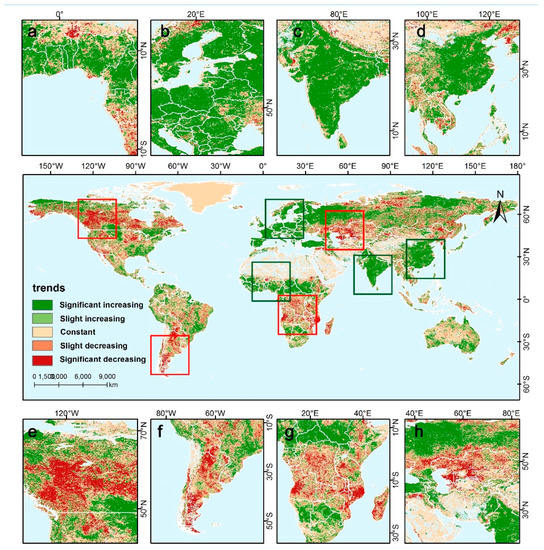 Spatial distribution of the temporal trends in NDVI from 1982 to 2015. ((a–d) is the major greening area in the world; (e–h) is the major browning area in the world).
