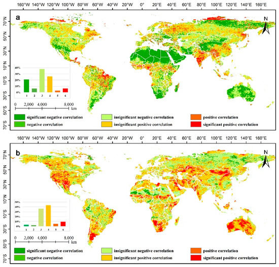 About 36% of the vegetation has experienced a positive and negative correlation with temperature, and among which about 27% is statistically significant. We performed correlation analysis at the temperature and NDVI, and they showed significant negative correlation in the relatively dry areas, such as North America (especially in the southern part of the US), southern Argentina, Sahara Desert, southern Africa, the Middle East, the Arabian Peninsula, northwestern China, northern Russia and Australia; which indicates that the increase in temperature is not conducive to the growth of vegetation in the region. The negative correlation may be caused by an increase in the evaporation of soil moisture resulting from the rise in temperature, which then leads to the decline of soil moisture; in this case, the ‘physiological drought’ of plants occurs and limits the photosynthesis and growth rate of plants [40]. On the equator or low latitude areas, such as the Sino–American isthmus, near the Amazonian estuary, Coast of the gulf of guinea, India and Yarlung Zangbo Grand Canyon [41], the distribution of the NDVI is significant positively correlated with temperature. These indicate that the growth of vegetation in these areas is greatly affected by temperature and increases with the increase of temperature. (Figure 5a)
