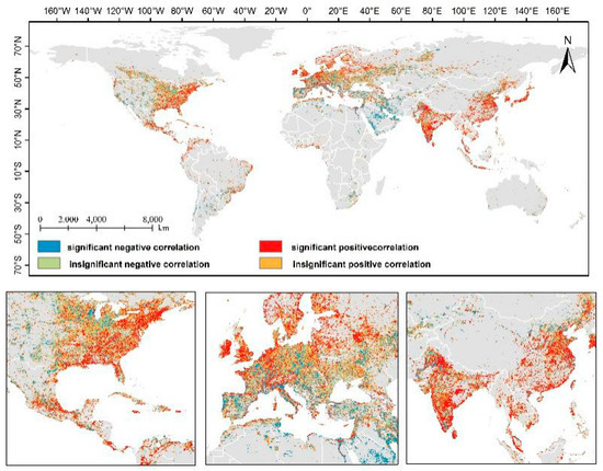 From a low-resolution perspective and from an overall perspective, the regions mentioned above, such as northern Europe, show high vegetation coverage (Figure 6), dense population and high economic development [43]; these regions also include eastern China [44,45,46]. In the Middle East, the dry climate is not conducive to vegetation growth, hence the NDVI value of less than 0.2 per year. A high nighttime lights index exists in developed cities where the NDVI and nighttime lights index show a negative correlation. Moreover, the enlarged view shows that the nighttime lights index and NDVI share a significantly negative correlation, with the correlation coefficient being less than −0.3 in the areas of London, Ganges River in India and other large cities such as the urban agglomerations along the Yangtze River.