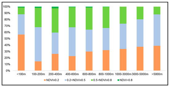According to the characteristics of global NDVI distribution, we divide the NDVI into four categories, namely, non-vegetation coverage area (NDVI ≤ 0.2), low vegetation coverage area (0.2 < NDVI ≤ 0.5), medium vegetation coverage area (0.5 < NDVI ≤ 0.8) and high vegetation coverage area (NDVI > 0.8) [38]. We found that the medium vegetation coverage area accounted for the largest proportion, reaching 42%, accounting for about half of the global continental area. In addition, the proportion of non-/very low vegetation coverage is the smallest, accounting for only 10%, followed by low vegetation coverage, accounting for 22%, and high vegetation coverage accounting for 26% (Table 1).