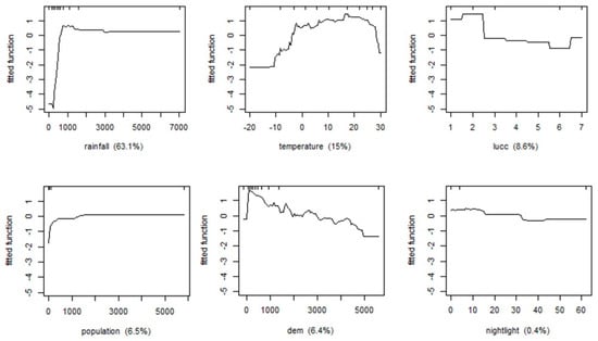 We use the Generalized Boosted Regression Models (GBM) package written by Elith in R language. Set the tree complexity = 5, learning rate = 0.005, and bag fraction = 0.5. In each calculation 50% of the data was extracted, and 5 cross validations was performed. A vegetation influencing factor model consisting of 3450 decision trees was constructed. Figure 8 shows the contribution rate of an independent variable to the influence of the dependent variable, as well as the relationship between the independent variable and the dependent variable when other independent variables remain unchanged or the mean value is taken. The results show that rainfall is the most important factor affecting vegetation evolution (63.1%), followed by temperature (15%), LUCC (8.6%), population (6.5%), DEM/elevation (6.4%) and nightlight (0.4%) (Figure 8).