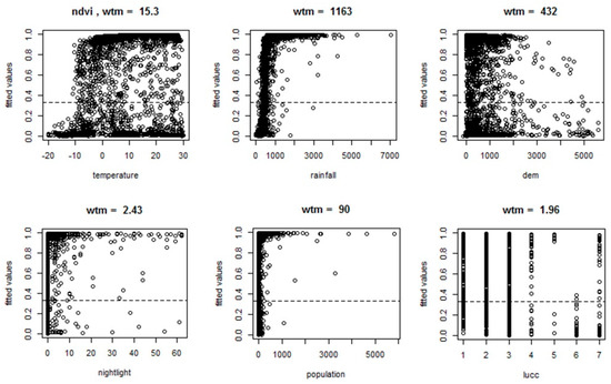 Figure 9 indicate the fitted values in relation to the six predictors used in the model. Areas with high vegetation coverage are concentrated in areas with temperatures greater than 0 °C, rainfall less than 3000 mm, and elevations less than 2000 m. Nightlight and population have less impact on NDVI.