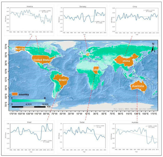 In our study, one typical country was selected from each continent to analyze the evolution trend of vegetation in the country, including the United States, Brazil, Germany, Sudan, China and Australia. We found that NDVI value of the countries on the upward trend were Brazil, China and Germany, while the countries on the downward trend were the United States, Sudan and Australia (Figure 10).