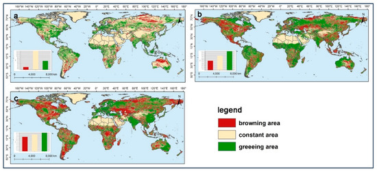 Trends in GIMMS NDVI 3g from 1982 to 1989 (a), 1990 to 1999 (b) and 2000 to 2015 (c).