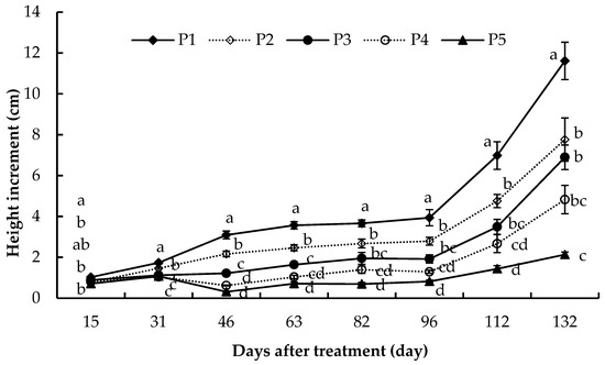 Height increments of Betula alnoides seedlings treated with 0 mg (P1, control), 2 mg (P2), 6 mg (P3), 10 mg (P4) and 20 (P5) mg paclobutrazol per seedling, respectively. The analyzed data were homogeneous and normal. Paired treatments with the same letters are not significantly different from each other at the level of 0.05 according to Tukey HSD test. Error bars represent standard errors.