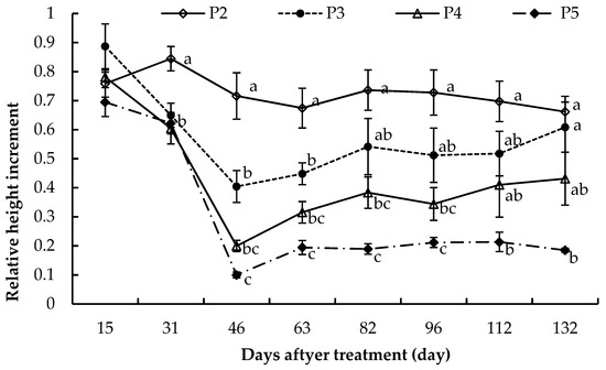 Relative increments in height of Betula alnoides seedlings treated with 2 mg (P2), 6 mg (P3), 10 mg (P4) and 20 (P5) mg paclobutrazol per seedling compared to the control (P1), respectively. Paired treatments with the same letter are not significantly different at the level of 0.05 according to Tukey HSD test. Error bars represent standard errors.