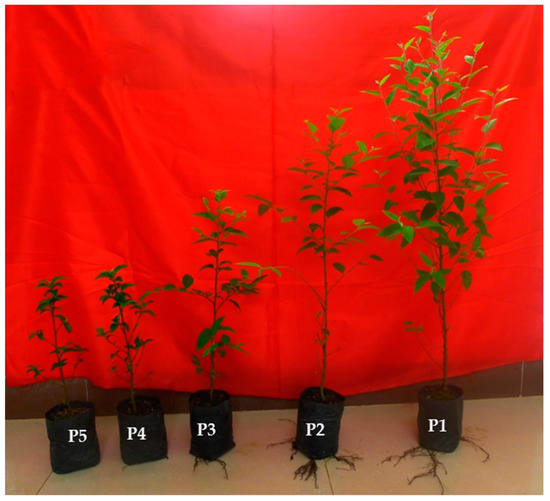Photographs of Betula alnoides seedlings in four and a half months after the paclobutrazol treatments. P1 (control), P2, P3, P4 and P5 refer to treatments of 0 mg, 2 mg, 6 mg, 10 mg and 20 mg paclobutrazol per seedling, respectively.