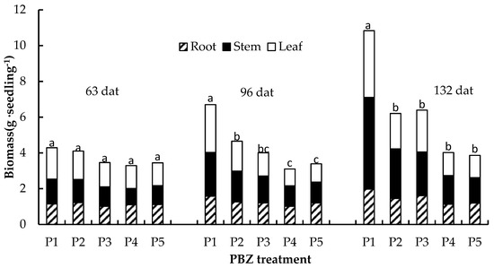 Effects of paclobutrazol (PBZ) treatment on biomass of Betula alnoides seedlings at 63 days, 96 days and 132 days after treatment (dat). P1 (control), P2, P3, P4 and P5 refer to treatments of 0 mg, 2 mg, 6 mg, 10 mg and 20 mg paclobutrazol per seedling, respectively. Paired treatments with the same letter are not significantly different at the level of 0.05 according to Tukey HSD test.