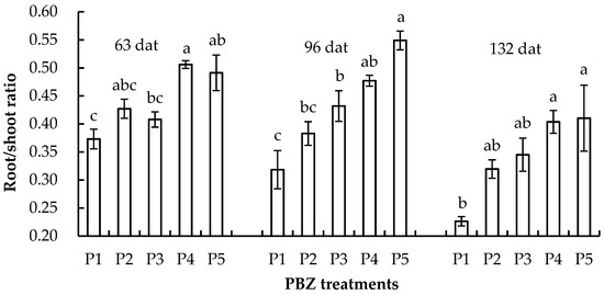 Effects of paclobutrazol (PBZ) treatment on root/shoot ratio of Betula alnoides seedlings at 63 days, 96 days and 132 days after treatment (dat). P1 (control), P2, P3, P4 and P5 refer to treatments of 0 mg, 2 mg, 6 mg, 10 mg and 20 mg paclobutrazol per seedling, respectively. Paired treatments with the same letter are not significantly different at the level of 0.05 according to Tukey HSD test. Error bars represent standard errors.