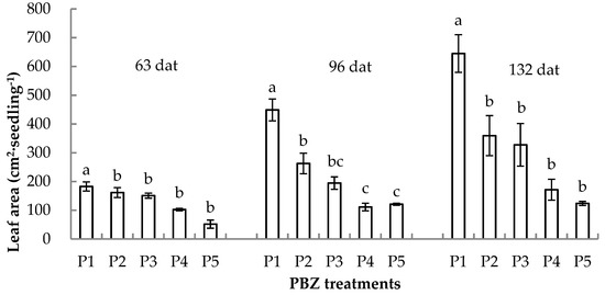 Effects of paclobutrazol (PBZ) application on leaf area of Betula alnoides seedlings at 63 days, 96 days and 132 days after treatment (dat). P1 (control), P2, P3, P4 and P5 refer to treatments of 0 mg, 2 mg, 6 mg, 10 mg and 20 mg paclobutrazol per seedling, respectively. Paired treatments with the same letter are not significantly different at the level of 0.05 according to Tukey HSD test. Error bars represent standard errors.