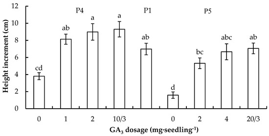 Height increments of the paclobutrazol-treated Betula alnoides seedlings in 15 days after gibberellin (GA3) application. P1 (control), P4 and P5 refer to seedlings under treatments of 0 mg, 10 mg and 20 mg paclobutrazol per seedling, respectively. Paired treatments with the same letter are not significantly different at the level of 0.05 according to Tukey HSD test. Error bars represent standard errors.