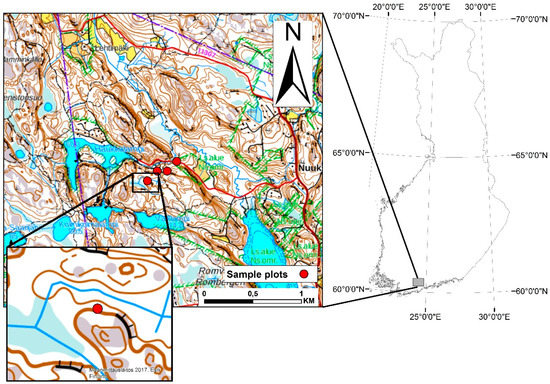 The location of study area in Nuuksio National Park in southern Finland. The location of all four sample plots is shown in the map on the left. A closer view of the terrain is given in the zoomed-in map, which represents one of the sample plots.
