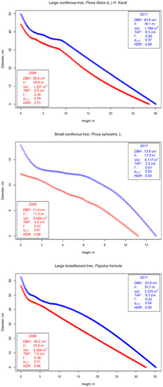 The change in stem diameters between T1 and T2 was also evaluated visually by plotting both taper curves simultaneously. For each sample tree, the changes in the stem form could be viewed throughout the whole tree from the taper curve plots. Taper curve plots gave additional information that was used in support when analyzing the detected change in stem attributes. For this study, three sample trees were selected for use as examples of visualization. The first selected tree was a Norway spruce with a DBH of 39.0 cm and a h of 28.6 m. Considering the attributes within the whole sample, the tree was determined as a “large coniferous tree”. The second example was a Scots pine with a DBH of 11.4 cm and a h of 11.2 m in 2008, which was classified as a “small coniferous tree”. The third example tree was an aspen with a DBH of 49.2 cm and a h of 32.6 m. It was determined as an example for a “large broadleaved tree”.