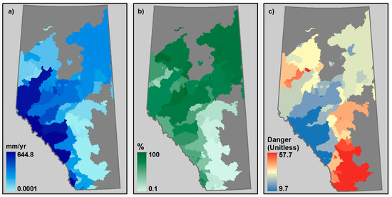 The creation of our index followed the same general logic as F2F, although fully reproducing this latter method would have been difficult due to major differences in data availability and structure. However, given the potential consequences that wildfires can have on drinking-water sources, it is crucial to obtain such first-order estimates provided by the SEI, even if not all of the data is available. This situation led to several differences between the two indices. First, the exposure model for Alberta focuses on threats from wildfire only. Using the FWI as a fire hazard proxy instead of a probability layer comparable to the US Wildland Fire Potential is the most important difference. The FWI System provides a suite of meaningful and easy-to-compute indicators of fire hazard. Hydrologic information was also treated differently; F2F used what was essentially the result of a water-budget model (i.e., precipitation-evapotranspiration) [71], whereas we used actual water yield information collected from water monitoring gauges. Comparatively, our approach was based on historical measurements of streamflow, which offer the potential to assess alternate scenarios. For example, once compiled, we could use the base data to assess how the regional pattern of exposure changes during dry years with exceptionally low annual flows.