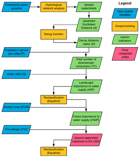 Here, we provide a spatial index, the Source Exposure Index (SEI), based on a generic multi-criteria framework to assess the exposure of forested watersheds to wildfire hazard. We used the definition of exposure proposed by the United Nations as “the situation of people, infrastructure, housing, production capacities, and other tangible human assets located in hazard-prone areas” [36]. Specifically, we aggregated information pertaining to water availability, water demand, forest cover, and fire danger in watersheds that supply surface water to 94 downstream communities in Alberta, Canada. The SEI is conceptually similar to F2F but differs in the source of data and their integration. Our objectives were to: (a) evaluate the exposure of source water supplying communities downstream of wildfire risk, and (b) develop and propose the first module of a larger pan-Canadian wildfire-water risk assessment framework. In contrast to previous efforts, our index identifies the spatial location of drinking-water supply intakes and relates these to forested water sources and their wildfire danger history. We believe that the flexibility of the index will facilitate its coupling with other water-resource indicators, as well as its integration into a Canadian water-security framework assessing various environmental-change scenarios and their potential impacts on national freshwater resources.