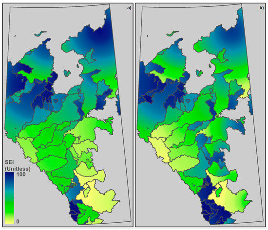 The province of Alberta relies on a number of environmental regulations that have put the protection of drinking water source watersheds at the forefront of environmental management, including: Alberta Environment’s Drinking Water Program [76], the Alberta Water Act [77], Water for Life [78], and the Standards and Guidelines for Municipal Waterworks [79]. These policies and regulatory frameworks aim at public health protection through the provision of safe drinking water. The province of Alberta also relies on a number of land and wildfire management practices and forest conservation policies, such as the Forest and Prairie Protection Act [80] and the Land Use Framework [81] to protect communities and other values at risk from wildfires. The protection of source watersheds is the third priority of the Alberta Fire Management Branch [82]. The environmental regulatory context of Alberta therefore lends support to the use of the SEI as a tool to identify those source watersheds with higher exposure to wildfires and where source water protection (SWP) planning should account for post-fire water contamination.