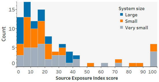 Distribution of Source Exposure Index scores for utilities serving variable number of consumers, with very small, small, and large systems serving less than 500, 500 to 5000, and more than 5000 people, respectively.