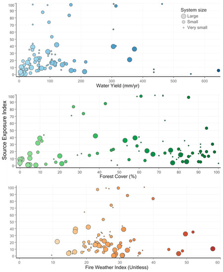 Scatterplots showing the relationship between the SEI score per source watershed and the three variables used to compute the index, namely the water yield, the forest cover, and the Fire Weather Index. The size of the dots are scaled by number of consumers served per drinking-water treatment plant, with very small, small, and large systems serving less than 500, 500 to 5000, and more than 5000 people, respectively. The shade of the dots helps to visualize change in the values of the different variables, darker tones showing greater values than lighter tones.