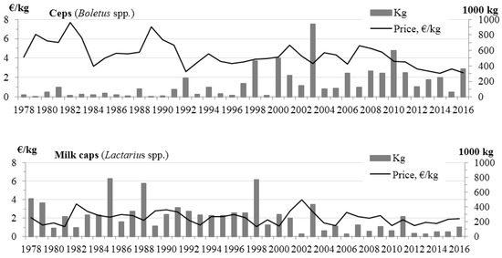 Annual data on mushroom and berry market prices (€/kg) and quantities (kg) were obtained from the statistics on the annual quantities of berries and mushrooms bought by organized trade and industry in Finland, the so-called “MARSI-statistics” [4]. This information included the quantities and prices of the most common berry and mushroom species, such as bilberry (Vaccinium myrtillus), cowberry (Vaccinium vitis-idaea), cloudberry (Rubus chamaemorus), ceps (Boletus edulis, B. pinophilus), milk caps (Lactarius trivialis, L. rufus, L. torminosus) and chanterelle (Chantarellus cibarius). For mushrooms, the statistics on market prices and quantities were obtained from eastern Finland only because mushroom collection mainly takes place in that area [4]. The statistics were based on annual inquiries to the companies in wild berry and mushroom markets and did not include direct trade to hotels, restaurants, and market places. The annual deflated prices and quantities of these mushrooms and berries in 1978–2016 are presented in Figure 1 and Figure 2. The producer price indices were used to deflate the prices (1949 = 100). The correlations among the deflated prices and quantities are given in Table 1.