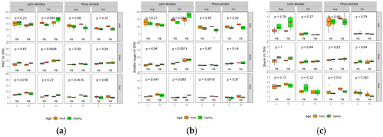 Non-structural carbohydrate concentration (% DW) (a), soluble sugar (% DW) (b), and starch (% DW) (c) (mean ± SE, n = 4) of different species (Pinus cembra L. and Larix decidua Mill.), age (sapling and adult tree), altitude (L for timberline and H for treeline), season (Aug for mid-growing season and October for late season) and tissues (current-year leaf, shoot, and fine root). Asterisks or “ns” at the bottom of subplot indicate significant (p < 0.05) or non-significant (p > 0.05) differences between saplings and adults within the same altitude and season, and the p-value at the top of subplot denote significance level by the Wilcoxon’s mean test between L and H. The red points in the subplot denote mean value and grey point for outlier.