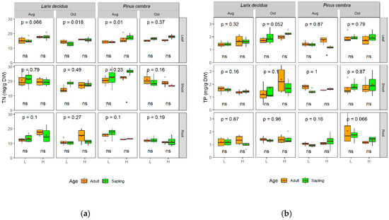 Total nitrogen (TN) (a) and phosphorus (TP) (b) concentrations (mg/g DW) (mean ± SE, n = 4) of different species (Pinus cembra L. and Larix decidua Mill.), age (sapling and adult trees), altitude (L for timberline and H for treeline), season (August for mid-growing season and October for late season), and tissues (current-year leaf, shoot, and fine root). Asterisks or “ns” at the bottom of subplot indicate significant (p < 0.05) or non-significant (p > 0.05) differences between saplings and adults within the same altitude and season, and the p-value at the top of subplot denote significance level by the Wilcoxon’s mean test between L and H.