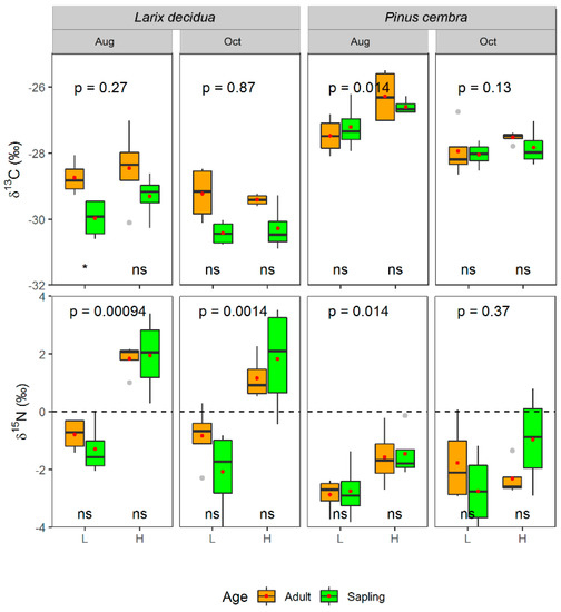 Leaf stable isotopes (δ13C‰; δ15N‰) (mean ± SE, n = 4) of different species (Pinus cembra L. and Larix decidua Mill.), age (sapling and adult tree), altitude (L for timberline and H for treeline), season (August for mid-growing season and October for late season). Asterisks or “ns” at the bottom of subplot indicate significant (p < 0.05) or non-significant (p > 0.05) differences between saplings and adults within the same altitude and season, and the p-value at the top of subplot denote significance level by the Wilcoxon’s mean test between L and H.