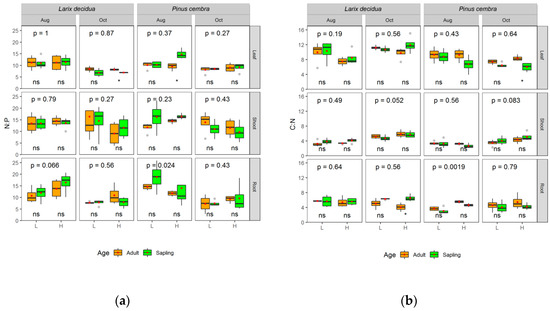 The ratio of N to P (a) and the ratio of C to N (b) (mean ± SE, n = 4) across tissues of the two species (Pinus cembra L. and Larix decidua Mill.), age (sapling and adult trees), altitude (L for timberline and H for treeline), season (August for mid-growing season and October for late season) and tissues (current-year leaf, shoot, and fine root). Asterisks or “ns” at the bottom of subplot indicate significant (p < 0.05) or non-significant (p > 0.05) differences between saplings and adults within the same altitude and season, and the p-value at the top of subplot denote significance level by the Wilcoxon’s mean test between L and H.