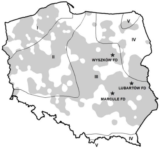 Experimental plots were located in three forest districts (FD): Lubartów (51°23′16.8″ N; 22°37′32.4″ E), Marcule (51°3′58″ N; 21°17′12″ E), and Wyszków (52°43′15″ N; 21°39′03″ E). The field studies were conducted in Lubartów FD in 2012 to 2013, in Marcule FD in 2014 to 2015, and in Wyszków FD in 2016 to 2017. Before planting, the area was an 80 to 100 years old Scots pine in fresh mixed coniferous Oxalis-Myrtillus type (OMT) stands, harvested two years before. The area was partially covered with grass and Myrtillus, and soil was prepared with a LPZ-75 plough. All evaluated forest districts are situated in the Middle European Plain Province of the Middle Europa Megaregion [], with similar winter temperatures (IIIrd soil freezing class, according to European Act (PN)-EN-12831) (Figure 1), and annual precipitation classified by Bojarczuk et al. [] as the continental climatic zone.