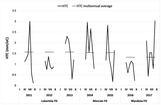 Monthly values of the hydrothermal coefficient (HTC) for research areas (source data: Institute of Meteorology and Water Management Bulletin).
