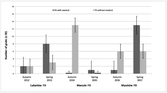 The comparison of the number of grubs of all stages and species found in sawdust pits and sawdust-free pits within each time period, assessed separately for FD districts (Figure 4), showed the following relationships: