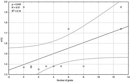 There was a significant relationship (p-value = 0.049) between the occurrence of grubs in the pits and the hydrothermal coefficient. The value of the correlation coefficient was R = 0.51, which indicates the moderate strength of this relationship (Figure 5). The higher value of the hydrothermal coefficient was associated with a higher number of grubs observed in the pits, as result of the better development of plants and their higher attraction.
