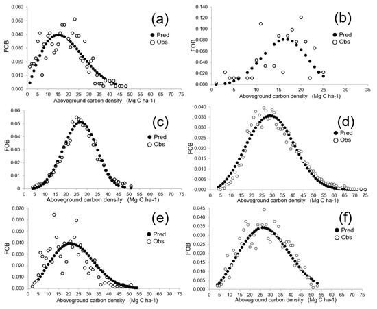 For the regions of the combined Northwest, Northeast and South-centre (Figure 2c,e), highest values of FOB were related with medium values of AGCD (from 15 to 35 Mg C ha−1), with a steeper distribution for the NW and NE compared to SC.