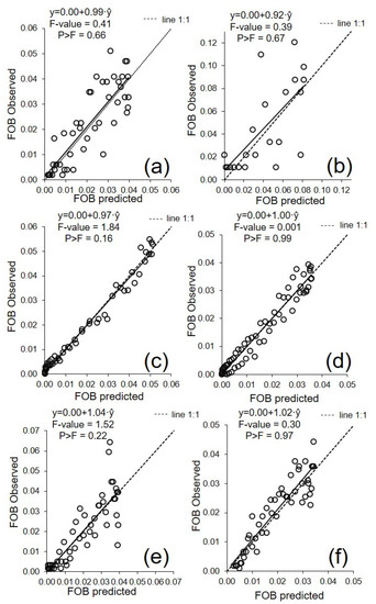 Predicted against observed fire occurrence by biomass level (FOB) for the regions CHAP (a); N (b); NW and NE(c); C (d); SC (e) and SE (f). F-values and probabilities (p > F) correspond to the simultaneous F-test for intercept = 0 and slope = 1. Dotted lines represent the 1:1 line and full lines represent the observed (y) against predicted (ŷ) FOB linear regression lines.