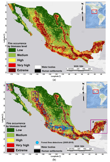 Globally, the country of Mexico ranks highly among areas of the largest fire activity [50]. Mexico has experienced a marked increase in the fire weather season due to climatic change [7]. Furthermore, fire activity in the North American region is projected to increase under climate warnings [6]. Therefore, a detailed knowledge of the spatial distribution of fire occurrence is increasingly necessary in the country to inform strategic fuel and fire management planning decisions. Moreover, from the scientific perspective, Mexico provides an opportunity to analyze the variability of wildfire occurrence and explore potential relationships to biomass by ecoregion, because it hosts a wide range of vegetation types and climate, from arid deserts dominated by scrubby vegetation, temperate pine–oak forests and tropical forests [51], that results in a variety of fire regimes in the country [52,53,54].