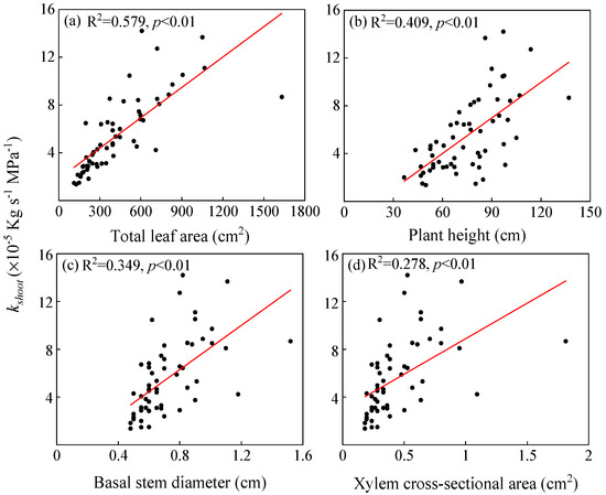 In our study, kshoot strengthened with increases in total leaf area, plant height, basal stem diameter, and xylem cross-sectional area. Hydraulic conductance is the most commonly used parameter of pressure gradient, calculated as the ratio of velocity of water flow in the plant stem to the pressure gradient. Typically, velocity of water flow in the stem increases with increasing stem diameter—increasing water transport capacity as a result [27,28,29]. Tall trees often have large stem diameters and large shoots. Large shoots maintain large transport areas and provide higher water flux; therefore, a positive relationship between the dimension of shoots and water transport capacity is a universal law [15,30]. More leaves require the enhancement of shoot capacity for transpiration, and a greater water transport capacity. Thus, for different trees, the more biomass or the larger the tree trunks, the greater the water conductivity. Within a tree, changes in leaf biomass can have the greatest effect on whole-shoot conductance, and whole-plant conductance.